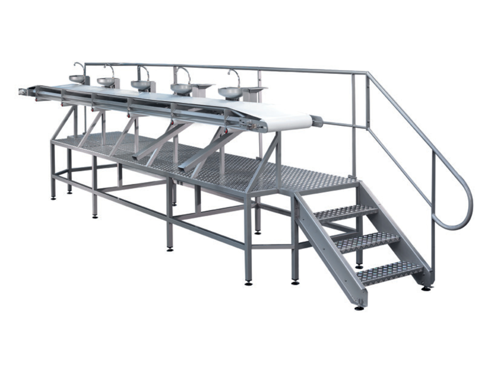 Conçus en acier inoxydable, nos ensembles d’éviscération se composent d’un podium de travail et de tapis de transport des viscères.