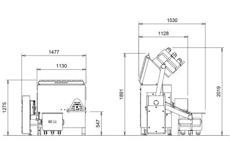 Sa grande trémie , protégée par un couvercle de sécurité, permet un chargement rapide et facile des produits à traiter. Sur demande, un chargeur hydraulique pour chariots de 90 litres peut également être intégré, même après l’achat, pour un confort d’utilisation accru.